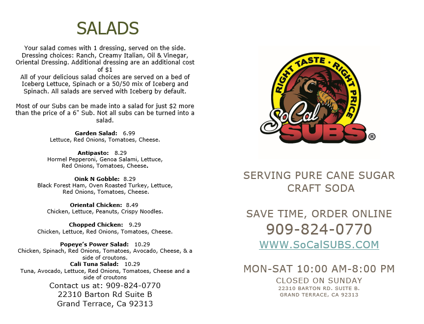 Bright and inviting, SoCal Subs is a spot where everyday moments feel a little more enjoyable thanks to food that’s straightforward and well-prepared. Ideal for a quick lunch break or a relaxed dinner, the menu’s balance of classic subs and lighter options like the Popeye’s Power Salad offers something for every appetite without overwhelming the senses.