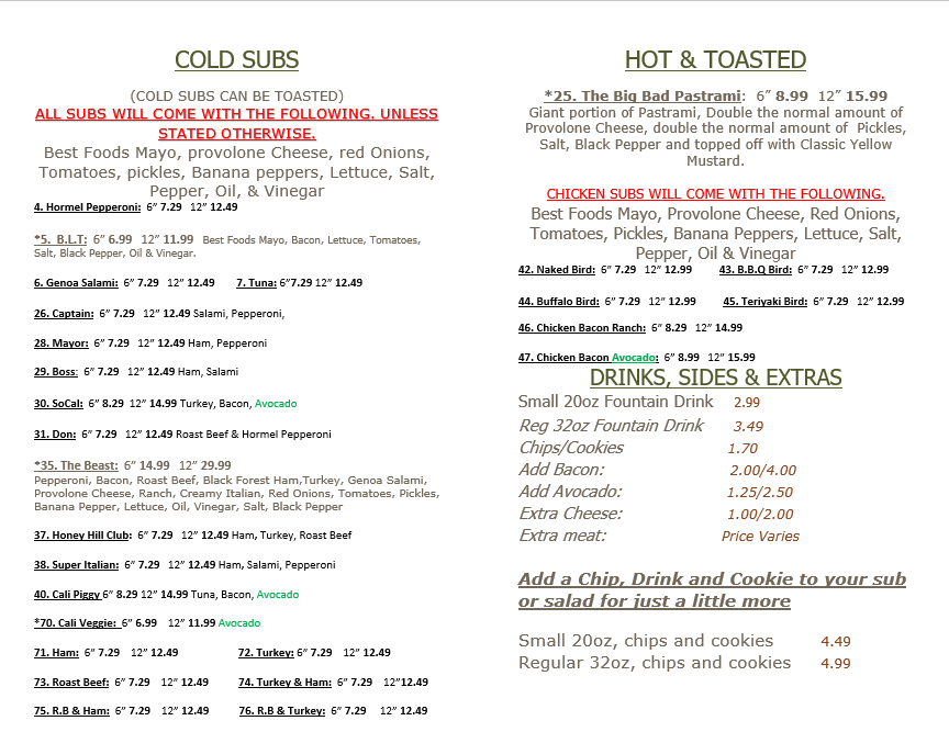 The menu at SoCal Subs offers a straightforward, casual approach to classic deli and sandwich fare, perfect for a quick lunch or a relaxed meal any time of day. You’ll find a variety of generously sized sub sandwiches, from hearty roast beef and hot pastrami to crowd favorites like the Turkey, Bacon & Avocado sub. The selection also includes fresh salads and a few comfort-driven extras like garlic cheese bread and vanilla soft serve ice cream to round out the experience.